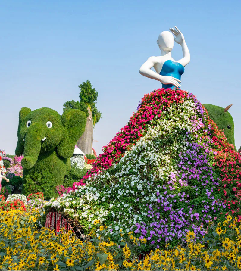 میراکل گاردن دبی نه تنها به دلیل تعداد بالای گل‌های آن شناخته می‌شود، بلکه به خاطر طراحی‌های خاص و منحصر به فرد مجسمه‌ها و سازه‌هایی که با گل‌ها پوشیده شده‌اند نیز مشهور است.